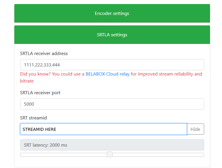 - Enter your information into the "SRTLA settings" box. If given the choice for SRTLA relay server, choose "CUSTOM"