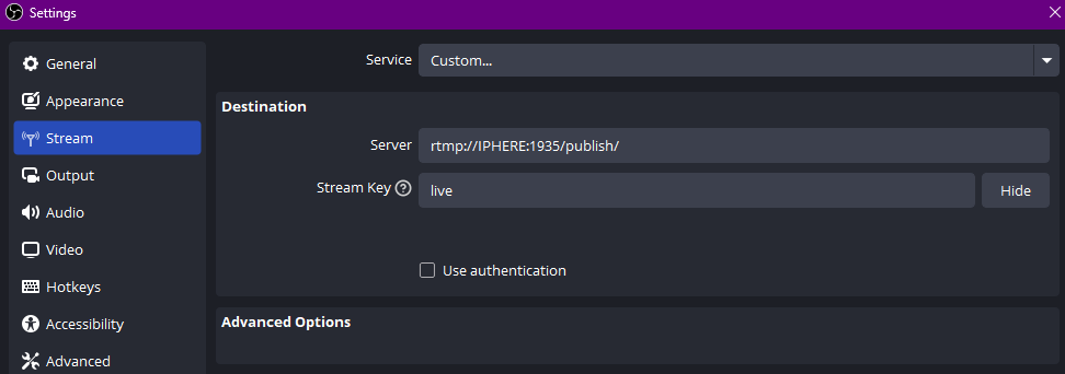 - Select "Stream", set the service to "custom" and enter your RTMP information in the server field. Enter the streamkey in the Stream Key field.