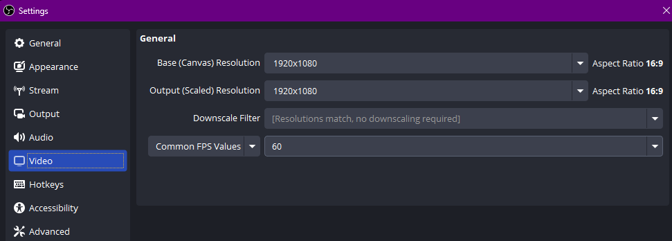 - Open the "Video" tab and change the output resolution to be 1920x1080 and set the common FPS values to 60 and then click Apply, then OK.